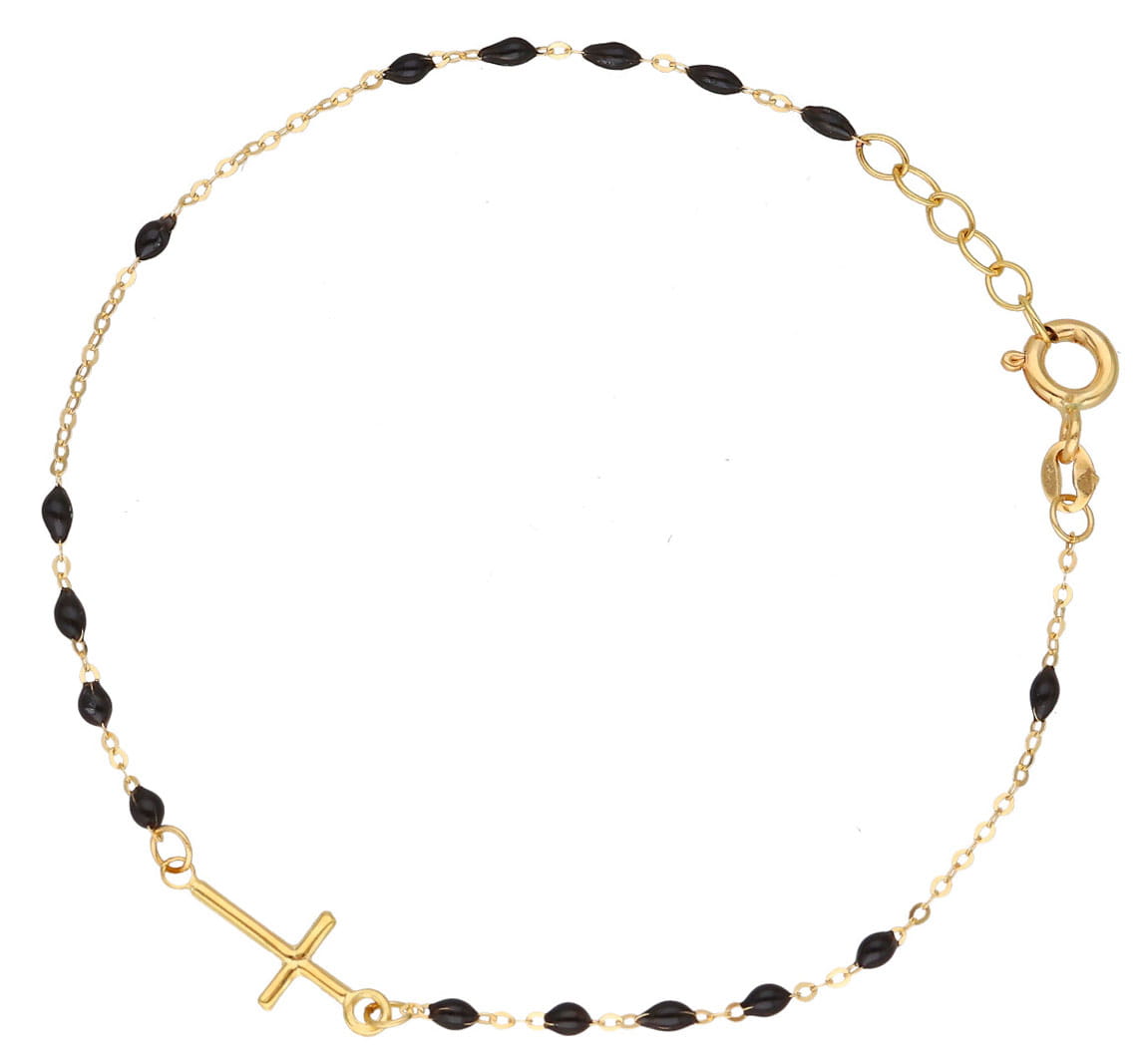 | Opis produktu | Złota bransoletka różańcowa, wraz z elementem ozdobnym w postaci krzyżyka oraz zdobieniem czarną emalią. Posiada przedłużkę umożliwiająca zmianę długości bransoletki. Maksymalna długość to 18 cm natomiast najkrótsza wersja to 16,5 cm. |