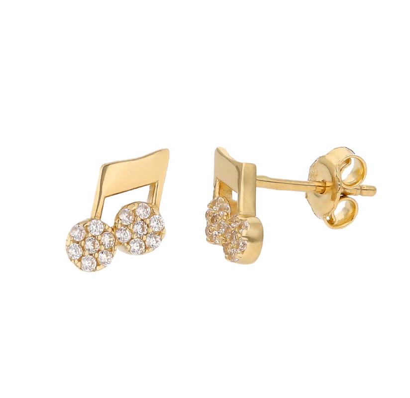 | Opis produktu | Złote kolczyki o kształcie nutek zdobione białą cyrkonią. Zapięcie typu sztyft. |