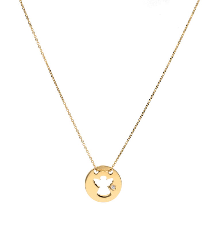 | Opis produktu | Złoty naszyjnik z elementem ozdobnym o kształcie koła z wyżłobionym aniołkiem wraz z białą cyrkonią. |
