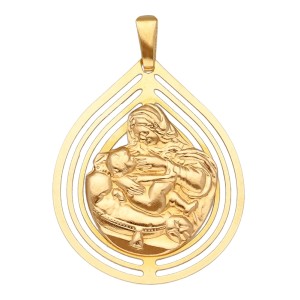 | Opis produktu | Złota zawieszka w kształcie ażurowej dużej łezki z wizerunkiem Matki Boskiej Karmiącej. Medalik w błysku. |