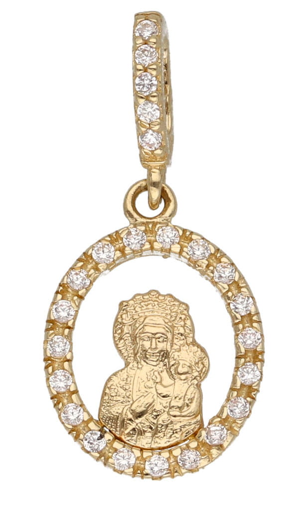 | Opis produktu | Złota zawieszka o kształcie Matki Boskiej Częstochowskiej w okręgu zdobiona białymi cyrkoniami. |