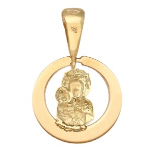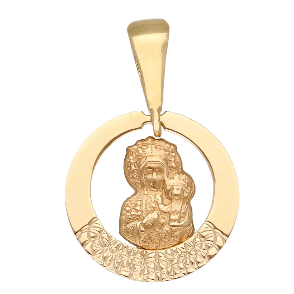| Opis produktu | Złota zawieszka o kształcie koła z wizerunkiem Matki Boskiej Częstochowskiej. |