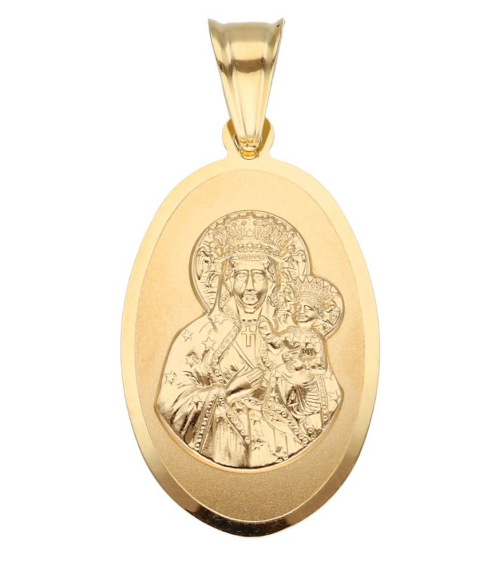 | Opis produktu | Złota zawieszka z wizerunkiem Matki Boskiej Częstochowskiej w owalu. |