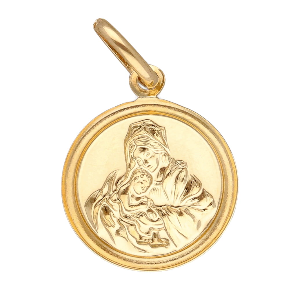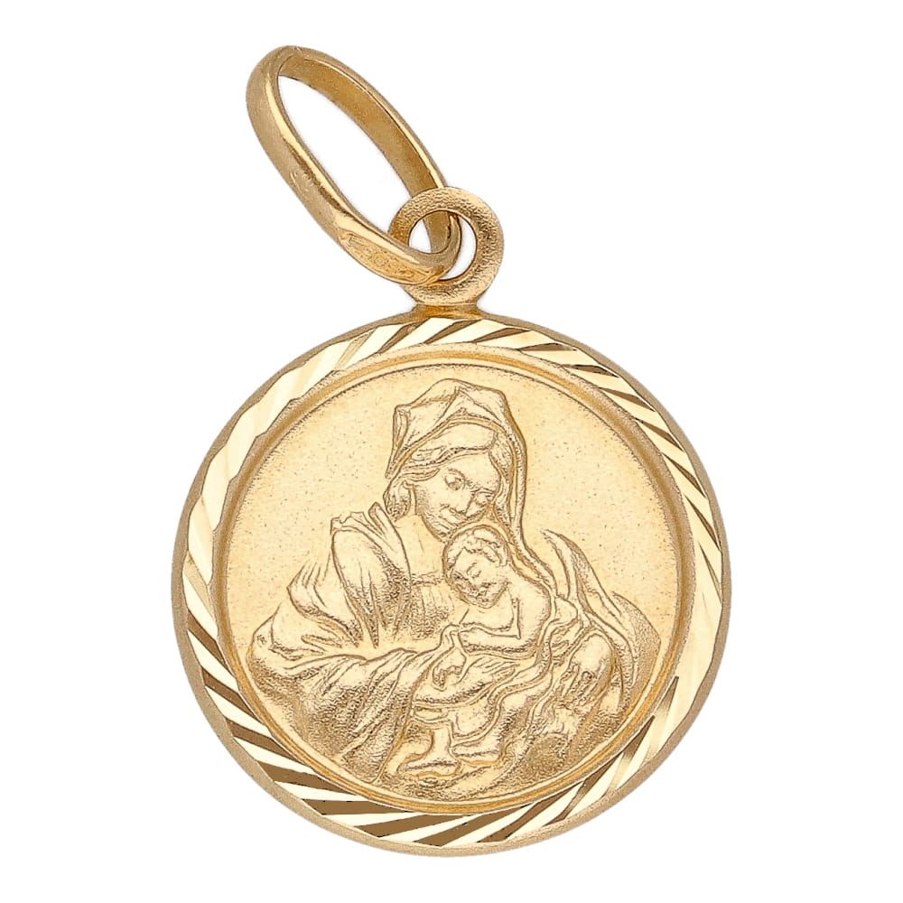| Opis produktu | Złota zawieszka o kształcie koła na którym wytłoczony jest wizerunek Matki Boskiej z Dzieciątkiem. Prawa strona medalika w macie a lewa w błysku. Natomiast obramowanie medalika posiada zdobny szlif dzięki czemu wszystko ładnie się mieni. |