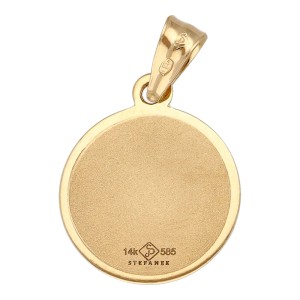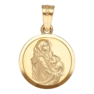 | Opis produktu | Złota zawieszka z wizerunkiem Matki Boskiej z Dzieciątkiem. Całość na okrągłej gładkiej blaszce gdzie wizerunek jest w macie. |