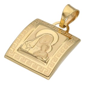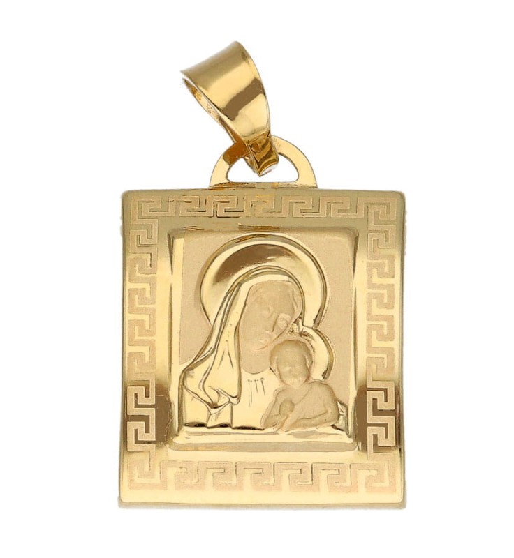 | Opis produktu | Złota zawieszka z wizerunkiem Matki Boskiej. Całość na pół wypukłej blaszce ze zdobieniem motywu greckiego. Idealny prezent dla chłopca. |
