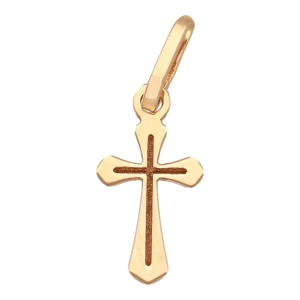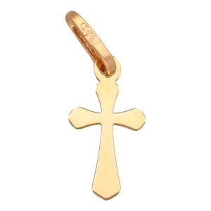 | Opis produktu | Złota mała zawieszka w kształcie płaskiego krzyżyka wraz ze żłobieniem wzoru krzyżyka w centralnym punkcie zawieszki. |
